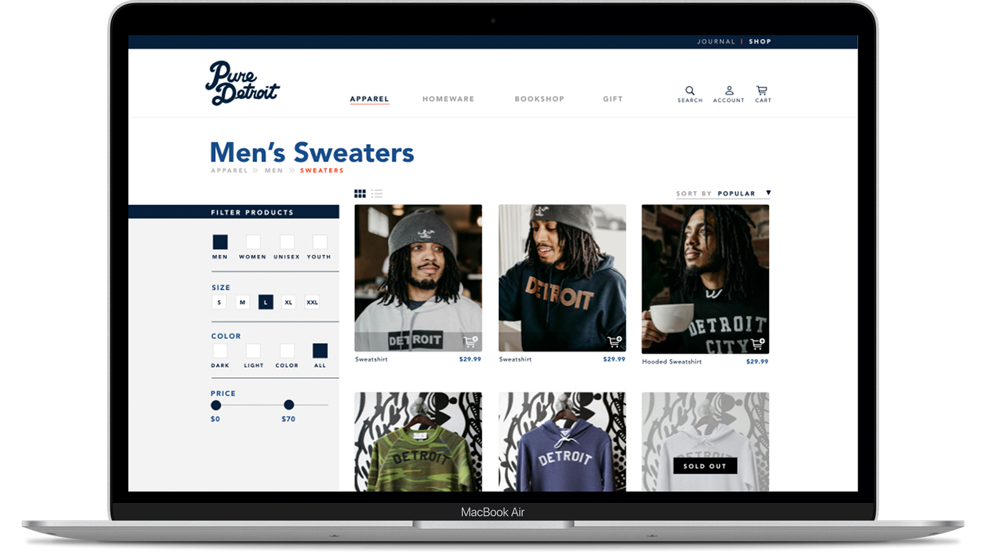 The early User Testing, Task Analysis on PureDetroit.com told us that locating products was a pain point. This was no surprise as the original site did not provide a product filtering system - an essential e-Commerce navigational feature.